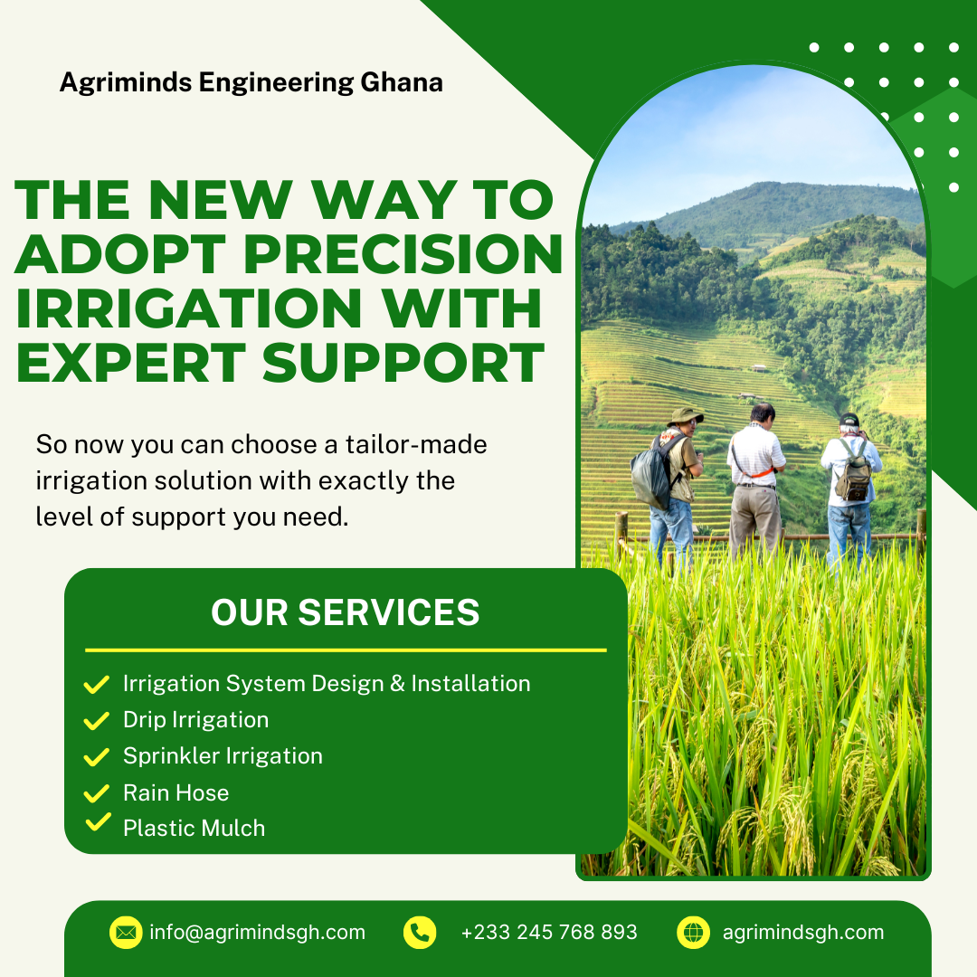 At Agriminds Engineering Ghana Limited, we specialize in providing top-tier irrigation solutions designed to keep your landscapes lush, healthy, and thriving all year round. With years of experience in the irrigation industry, our team of experts is committed to offering sustainable and efficient systems tailored to meet the unique needs of each property. Are you a farmer in need of water-efficient solutions, we’ve got you covered.
